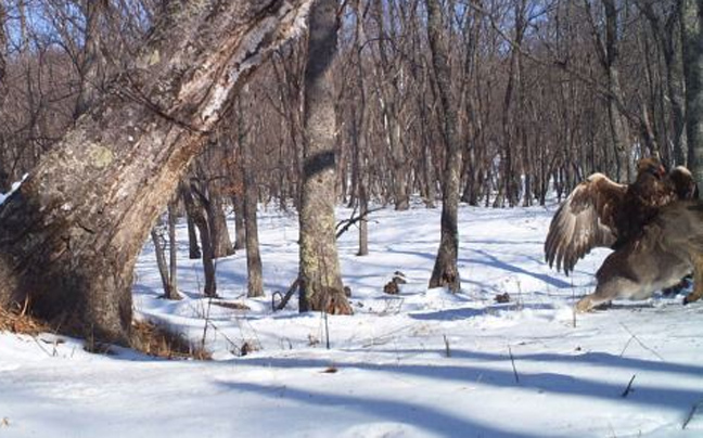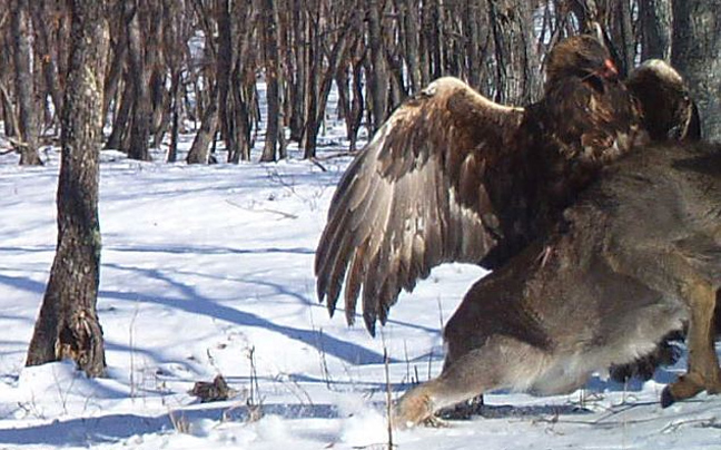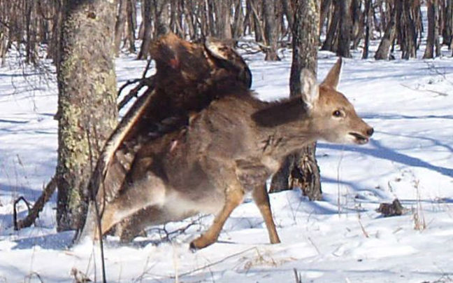 Στα τρία καρέ που τραβήχτηκαν στην περιοχή Lazovsky της Ρωσίας, ο χρυσαετός φαίνεται να επιτίθεται στο ελάφι από πίσω, να βυθίζει τα νύχια του στη σάρκα του άτυχου ζώου, και να επιχειρεί να το τραβήξει μακριά.