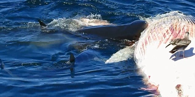 Τουλάχιστον τρεις λευκοί καρχαρίες και πολλοί περισσότεροι μπλε είχαν περικυκλώσει το νεκρό θαλάσσιο θηλαστικό. Οι τουρίστες παρακολούθησαν το θέαμα με ένα συνδυασμό φρίκης και ενδιαφέροντος.