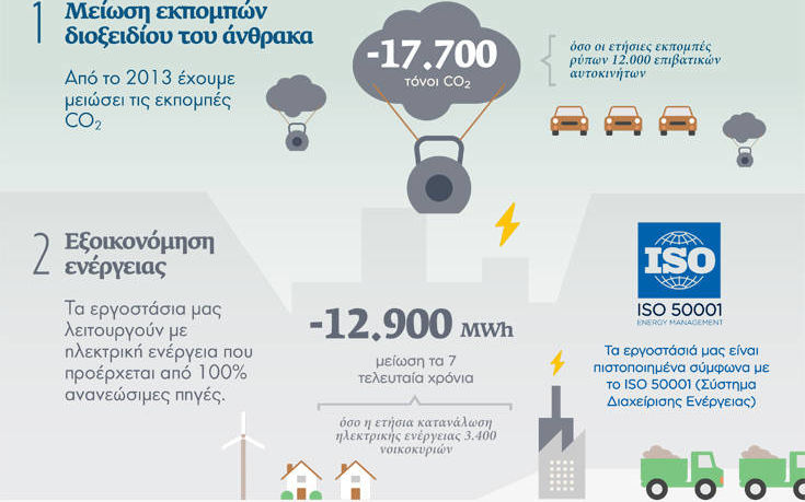 - Τα εργοστάσιά της, λειτουργούν με ηλεκτρική ενέργεια που προέρχεται από 100% ανανεώσιμες πηγές, έχοντας εξοικονομήσει τα τελευταία 7 χρόνια 900 μεγαβατώρες (MWh), που αντιστοιχούν στην ετήσια κατανάλωση για φωτισμό μιας πόλης όπως η Καβάλα.