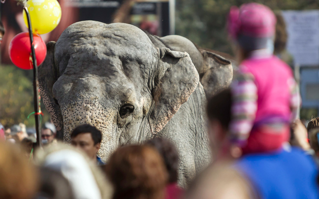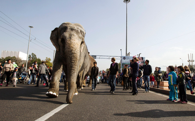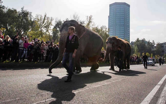 Στο Καζακστάν τα μέλη του μαζί με τους άτυχους ελέφαντες που κάνουν τα διάφορα νούμερα έκαναν παρέλαση στην πόλη Αλμάτι ενόψει του σόου που θα παρουσιάσουν.