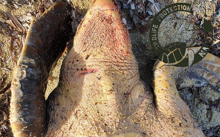 Η ενήλικη αρσενική καρέτα καρέτα εντοπίστηκε «στην ακτογραμμή και τη μεταφέραμε στην παραλία. Η χελώνα φαινόταν ζωντανή, αλλά κατά τον έλεγχο ήταν σε ημιθανή κατάσταση ή είχε επιθανάτιες αντιδράσεις. Αφού επιβεβαιώσαμε το θάνατο της, σε λεπτομερέστερο έλεγχο διαπιστώσαμε μια τομή 5 εκατοστών στο λαιμό της από την οποία έτρεχε ακόμη αίμα…», όπως αναφέρεται -μεταξύ άλλων- στην ανάρτηση του συλλόγου στο Facebook, όπου δημοσιεύτηκε και σχετικό φωτογραφικό υλικό.