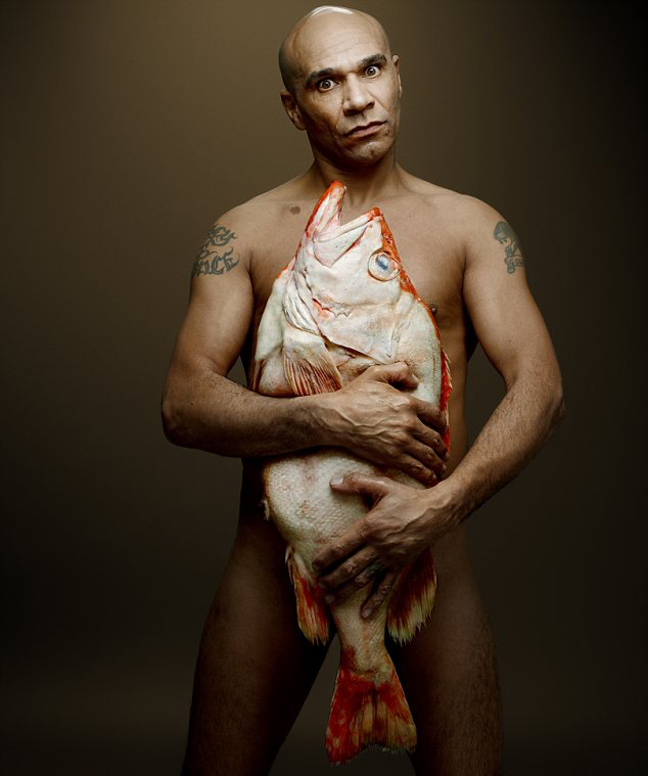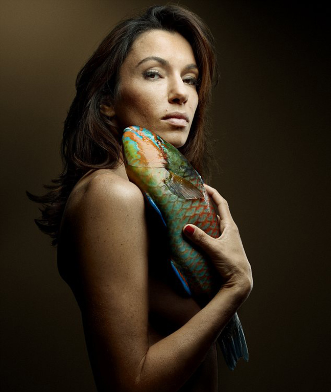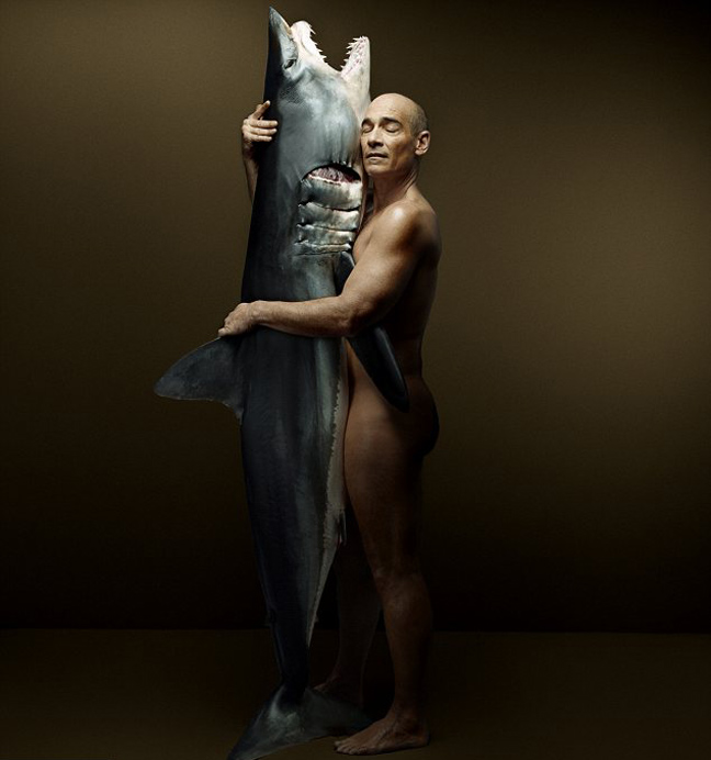 Οι άνδρες είχαν πάντως πιο ευφάνταστες πόζες: Ο Jean Marc-Barre φωτογραφήθηκε με έναν καρχαρία μάκο και ο ράπερ Goldie με ένα κοκκινόψαρο.