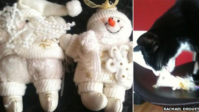 Φέτος όμως, τον συνεπήρε πραγματικά το πνεύμα των Χριστουγέννων και αντί για τα συνήθη «δώρα» του, κάλτσες, ρούχα, φορτιστές κινητών τηλεφώνων και παιχνίδια άλλων γατιών, επέλεξε χριστουγεννιάτικα στολίδια που οι ιδιοκτήτες του πιστεύουν πως έκλεψε από τα δέντρα των γειτόνων τους.