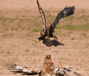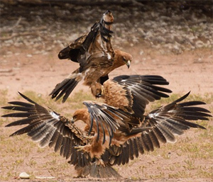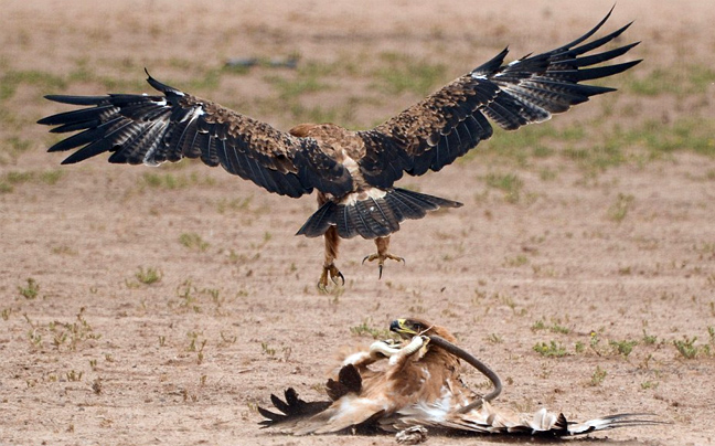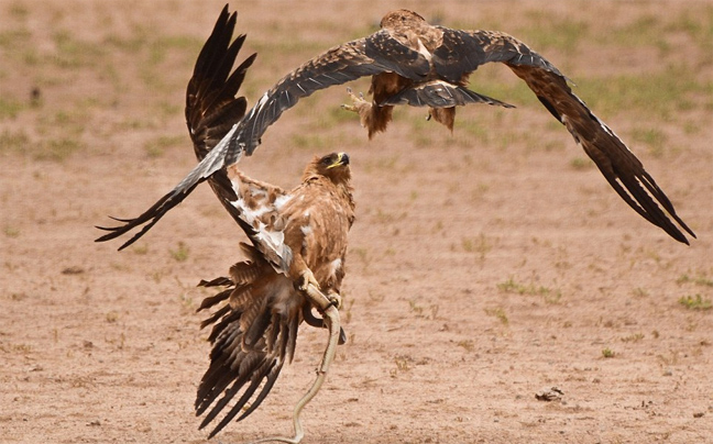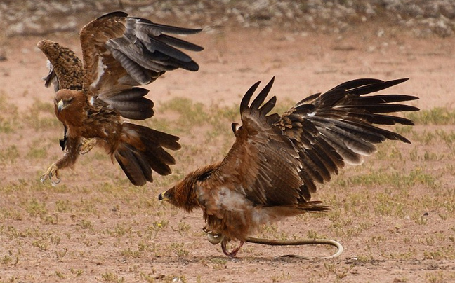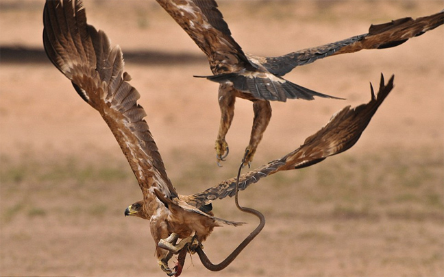 Η φωτογράφος Anja Denker κατέγραψε τη δραματική στιγμή όπου τρεις αετοί επιδίδονται σε μάχη στον αέρα για ένα φίδι. Ένας αετός του είδους Tawney άρπαξε μια δηλητηριώδη κόμπρα και ήταν έτοιμος να φύγει μακριά μαζί με το φαγητό του.