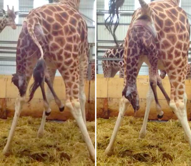 Οι καμηλοπαρδάλεις εγκυμονούν για διάστημα 14 έως 16 μηνών και γεννούν όρθιες για να καταφέρουν να κόψουν τον ομφάλιο λώρο, σημειώνει η Daily Mail.