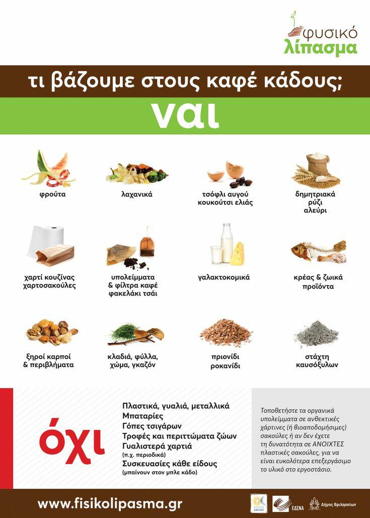 Υπολείμματα από φρούτα, λαχανικά, τσόφλι αβγού, κουκούτσια ελιάς, δημητριακά, ρύζι αλεύρι, χαρτί κουζίνας και χαρτοσακούλες, μαγειρεμένο κρέας ή ψάρι και άλλα ζωικά προϊόντα, ξηροί καρποί και τα περιβλήματά τους, γαλακτοκομικά προϊόντα καθώς και κλαδέματα, φύλλα, χώμα, γκαζόν, ροκανίδι, πριονίδι και στάχτη από καυσόξυλα θα ακολουθούν πλέον μια νέα διαδρομή, εντελώς διαφορετική από ό,τι ως τώρα.