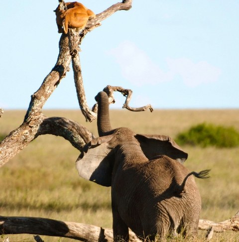 Κάτι που φυσικά έσωσε σε κάποιο βαθμό την «τιμή» της, καθώς ο ελέφαντας όσο κι αν προσπάθησε να τη ρίξει κάτω κουνώντας με την προβοσκίδα και τα πόδια του τα κλαδιά, δεν τα κατάφερε.
