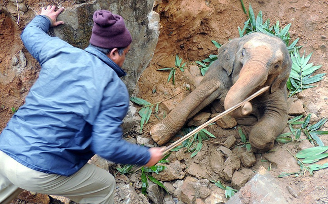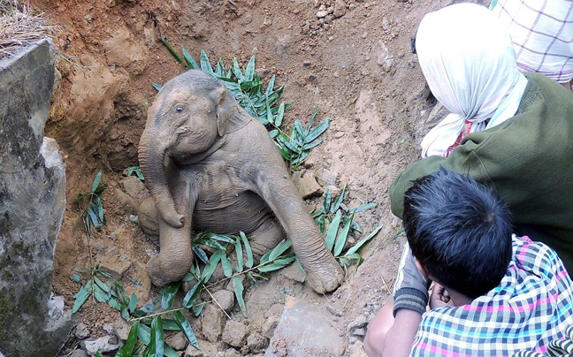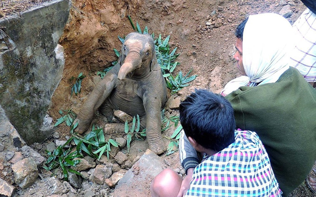 Αγωνιζόταν να μείνει δίπλα στο κοπάδι του ο μικρός ελέφαντας της φωτογραφίας, στην Ινδία, αλλά το μέγεθός του τον πρόδωσε: γλίστρησε σε έναν λάκκο, κάτω από ράγες τραίνου, και παγιδεύτηκε εκεί καθώς ήταν πολύ μικρός για να καταφέρει να βγει.