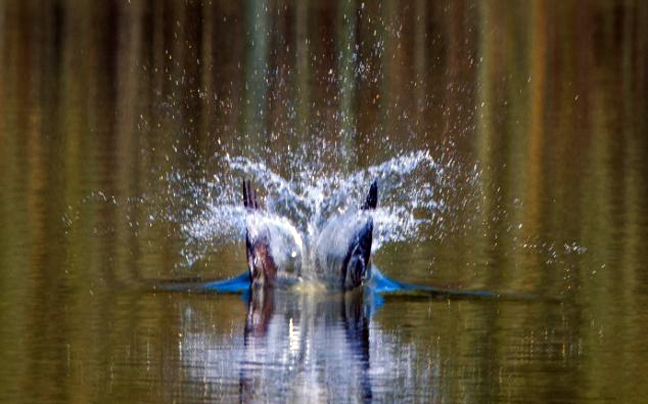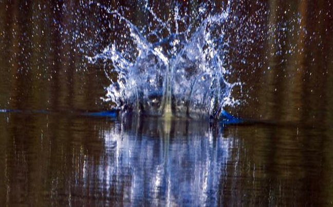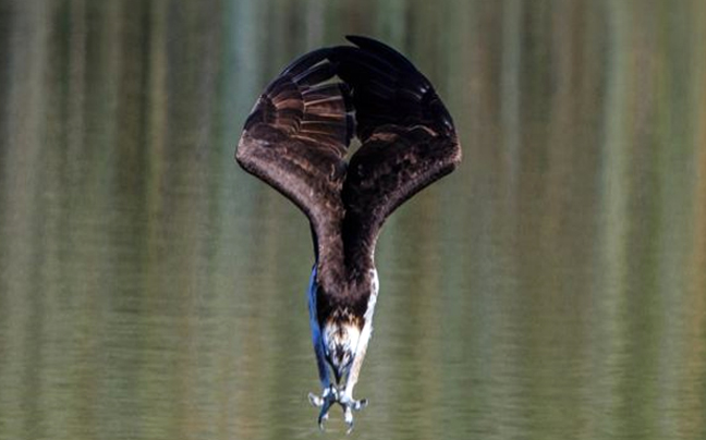 Το πτηνό εντοπίζει τη λεία του πετώντας από ψηλά, στη συνέχεια εφορμά με ταχύτητα, βουτάει στο νερό και αρπάζει ένα ψάρι.