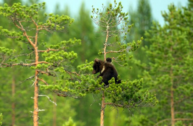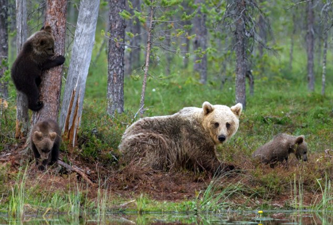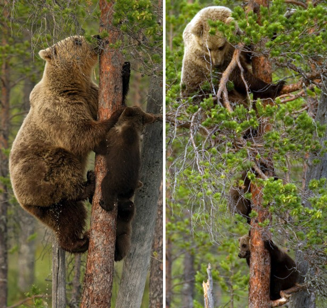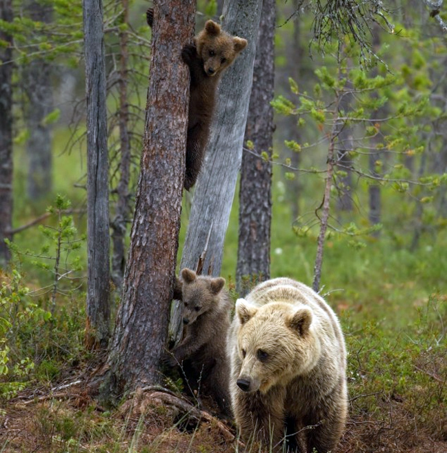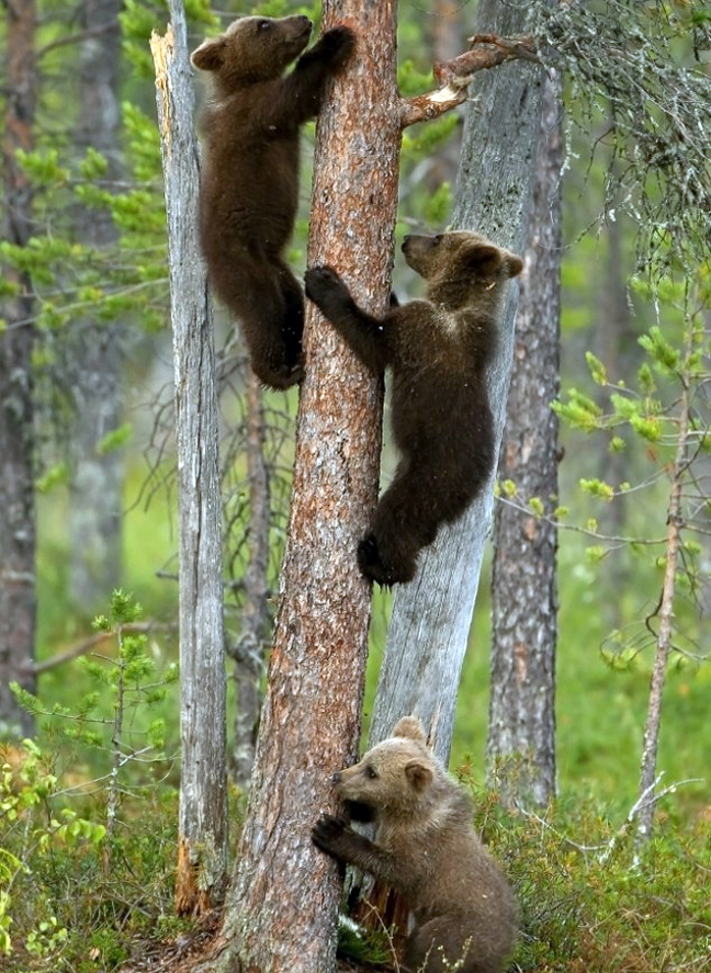 Έτσι, ο φωτογραφικός φακός «συνέλαβε» στη Φινλανδία την εικονιζόμενη καφέ αρκούδα και τα μικρά της σε ώρα… μαθήματος. Η μαμά έδειξε πρώτη πώς γίνεται το σκαρφάλωμα στα δέντρα και στη συνέχεια τα αρκουδάκια πήραν θέση.