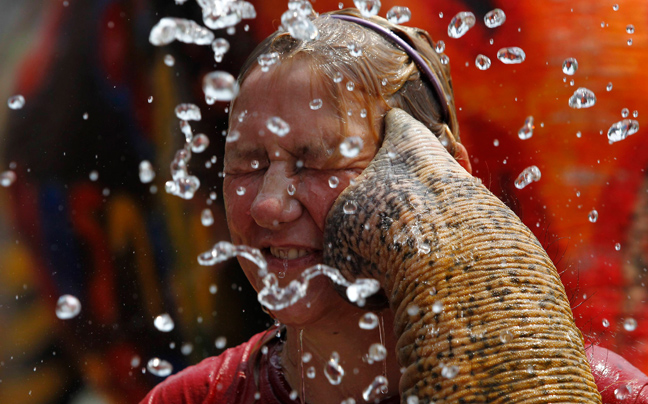 Οι παριστάμενοι έχουν την ευκαιρία να «δροσίσουν» τους ελέφαντες αλλά στη συνέχεια μπουγελώνονται και οι ίδιοι καθώς παίρνουν τη σκυτάλη οι… προβοσκίδες.