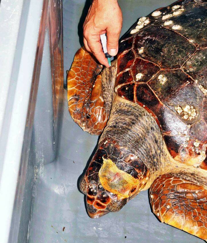 Σύμφωνα με το ΙΝΑΛΕ, η χελώνα η οποία έχει μήκος καβουκιού 66 εκατοστά και ζυγίζει γύρω στα 45 κιλά, έφερε ελαφρύ κάταγμα στο κεφάλι από χτύπημα με βαρύ αντικείμενο. Δέχθηκε τις πρώτες βοήθειες από το προσωπικό του Iνστιτούτου, καθαρίστηκε η πληγή με αντιβιοτικές αλοιφές και τοποθετήθηκε σε δεξαμενή χωρίς νερό, αλλά με πρόνοια ώστε να μην αφυδατωθεί. Εκεί θα παραμείνει μέχρι να κλείσει η πληγή και να αναρρώσει.