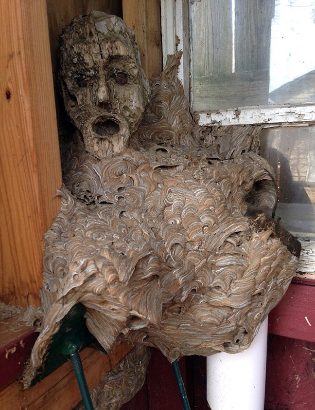 Οι σφήκες έφτιαξαν τη φωλιά τους κάτω από μία ξύλινη μάσκα με τρομακτική όψη συνθέτοντας έναν ακόμα πιο τρομακτικό συνδυασμό: μια σφηκοφωλιά με ανθρώπινο κεφάλι!