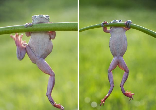 Ναι καλά διαβάσατε. Το εν λόγω αμφίβιο δεν πιάνεται σε κλαδιά και κορμούς φυτών απλώς για να ανέβει και να ξεκουραστεί όπως θα πίστευαν πολλοί, αλλά για να κάνει άρσεις και να δυναμώσει τα άνω άκρα του, όπως φαίνεται και στις φωτογραφίες. Μάλιστα, φαίνεται πως αντέχει να κάνει τη συγκεκριμένη γυμναστική επί δέκα συνεχόμενα λεπτά!