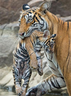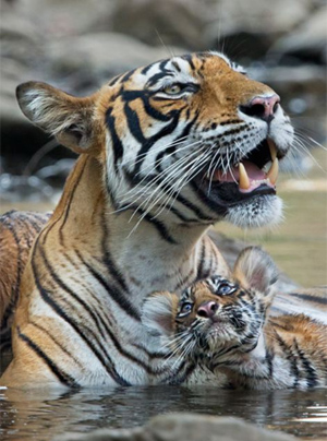 Η Νουρ, μια τίγρης της Βεγγάλης, γέννησε πριν τρεις μήνες και από τότε κρατούσε τα μωρά της προφυλαγμένα σε μια σπηλιά. Ο υδράργυρος «χτύπησε» τους 44 βαθμούς Κελσίου όμως και η μητέρα αναγκάστηκε να βγάλει τα παιδιά της από το σημείο αυτό και να τα βουτήξει στα νερά μιας ρηχής… πισίνας που υπάρχει στο πάρκο της Ινδίας. Αυτό… περίμενε και ο φωτογράφος άγριας φύσης Άντι Ρους, ο οποίος δεν έχασε την ευκαιρία να φωτογραφίσει τη μαμά με τα δύο τιγράκια της την ώρα που τα έπλενε για πρώτη φορά στο νερό και τα καθοδηγούσε με τις κινήσεις της για να είναι ασφαλή.
