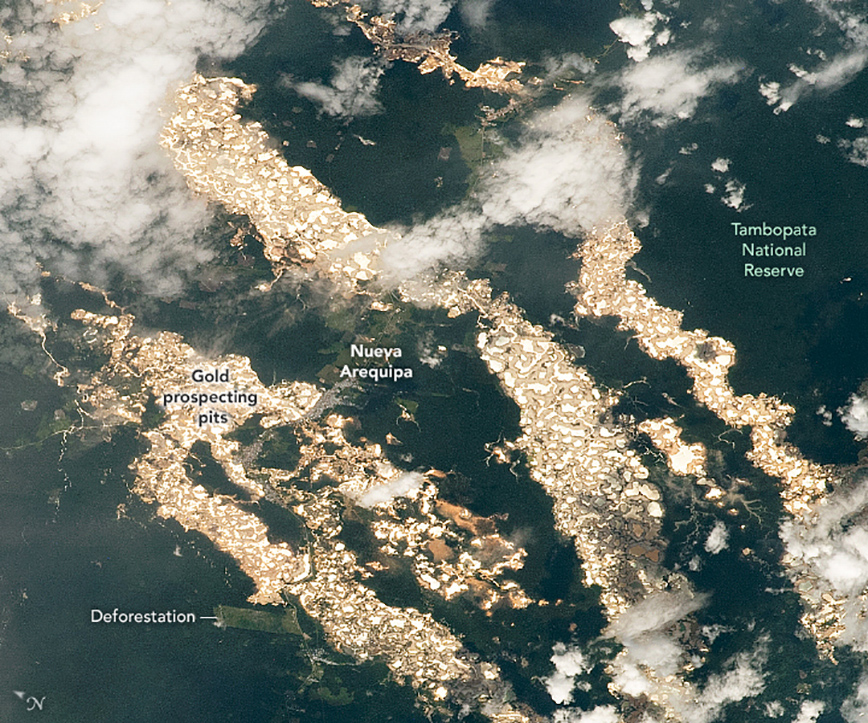 Στην εικόνα αποκαλύπτεται το μέγεθος της εξόρυξης χρυσού, μεγάλο μέρος της οποίας γίνεται παράνομα, στο τροπικό δάσος του Αμαζονίου στο Περού. Τα «ποτάμια χρυσού» είναι στην πραγματικότητα ανοιχτοί λάκκοι που πιστεύεται πως έχουν σκάψει παράνομα χρυσωρύχοι, σύμφωνα με τη διαστημική υπηρεσία.