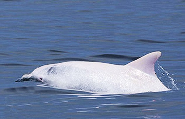 Τα ρινοδέλφινα έχουν συνήθως γκρι χρώμα, όμως λόγω μιας γονιδιακής μετάλλαξης τα δελφίνια αλμπίνο έχουν λευκό δέρμα και ροζ μάτια.