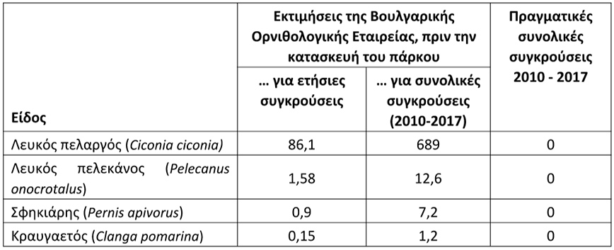 Παρουσιάζει ενδιαφέρον το γεγονός ότι η μελέτη συγκρίνει τις πραγματικές συγκρούσεις πτηνών από τα είδη ενδιαφέροντος, κατά τα 8 πρώτα χρόνια λειτουργίας του αιολικού πάρκου (2010 – 2017), με τις εκτιμήσεις της Βουλγαρικής Ορνιθολογικής Εταιρείας πριν την κατασκευή του, οι οποίες διαπιστώνεται από τη μελέτη ότι είναι υπερβολικές.