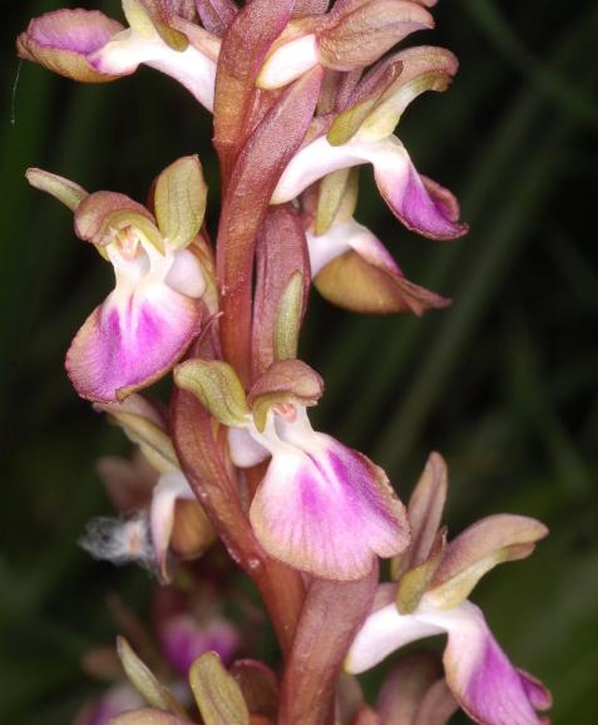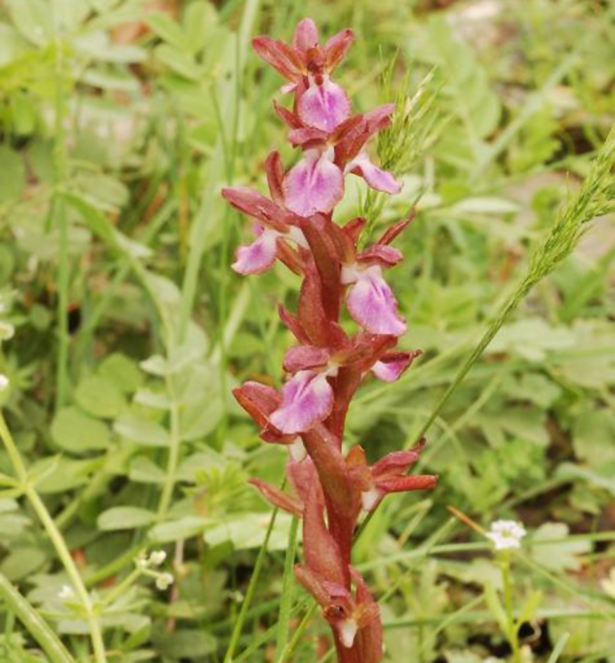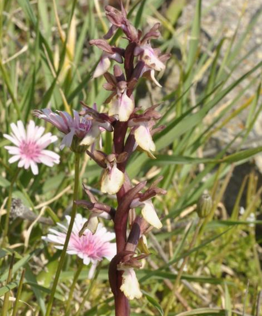«Με μια μακροσκοπική εκτίμηση», όπως λέει ο Γιάννης Καρατζάς, «κυριαρχούσαν τα φυτά με το λευκό χείλος (αρκετοί αποκαλούν την ποικιλία αυτή με τον «τίτλο»: Anacamptis collina var. leucoglossa – λευκό χείλος, μοβ-καφέ-πράσινο περιάνθιο). Έτσι λοιπόν, έχουμε στο Πάρκο του Απολιθωμένου Δάσους Λέσβου, μια εντυπωσιακά ανάμεικτη παρουσία του ονομαστικού είδους. Στο Πάρκο συναντώνται δύο υποείδη, η Serapias orientalis ssp. Carica και η Serapias orientalis ssp. Οrientalis. H Serapias orientalis ssp. carica, είναι μια ακόμη ιδιαίτερα πολυπληθής ομάδα ορχεοειδών στο Πάρκο».