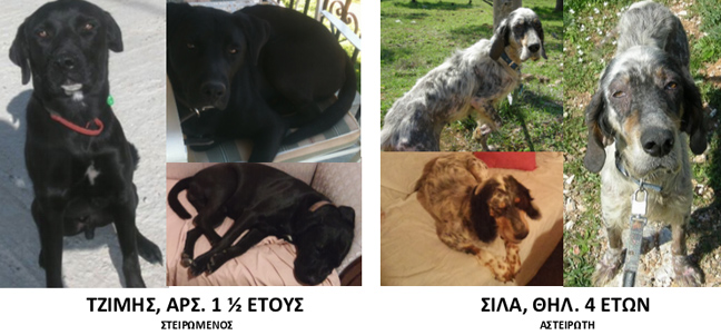 Όπως διευκρινίζουν: «Η Σίλα είναι σε οίστρο. Την παράτησαν πριν λίγους μήνες με ψώρα, καλαζάρ και νεφρική ανεπάρκεια και για αυτό δεν είχε στειρωθεί ακόμη. Ο Τζίμης έχει άσπρο μουσάκι κι έναν άσπρο ρόμβο στο στέρνο, φοράει χοντρό καφέ δερμάτινο περιλαίμιο και σκάλιμπορ και η Σίλα έχει καφέ πιτσιλιές σε πρόσωπο και πόδια και φοράει λεπτό μπλε υφασμάτινο περιλαίμιο και σκάλιμπορ».