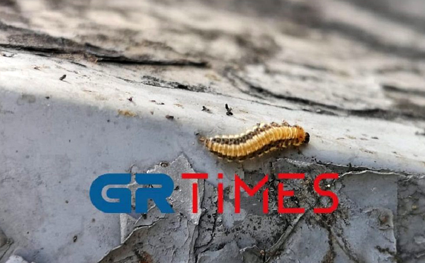 Πρόκειται για την κάμπια Galeruca luteola, ο πληθυσμός της οποίας είναι τόσο μεγάλος που πολλές φορές αυτές «ξεφεύγουν» από την ειδική κολλώδη ουσία που έχει τοποθετήσει ο δήμος στους κορμούς για την αντιμετώπιση τους και κάνουν… επιδρομή στο πεζοδρόμιο.