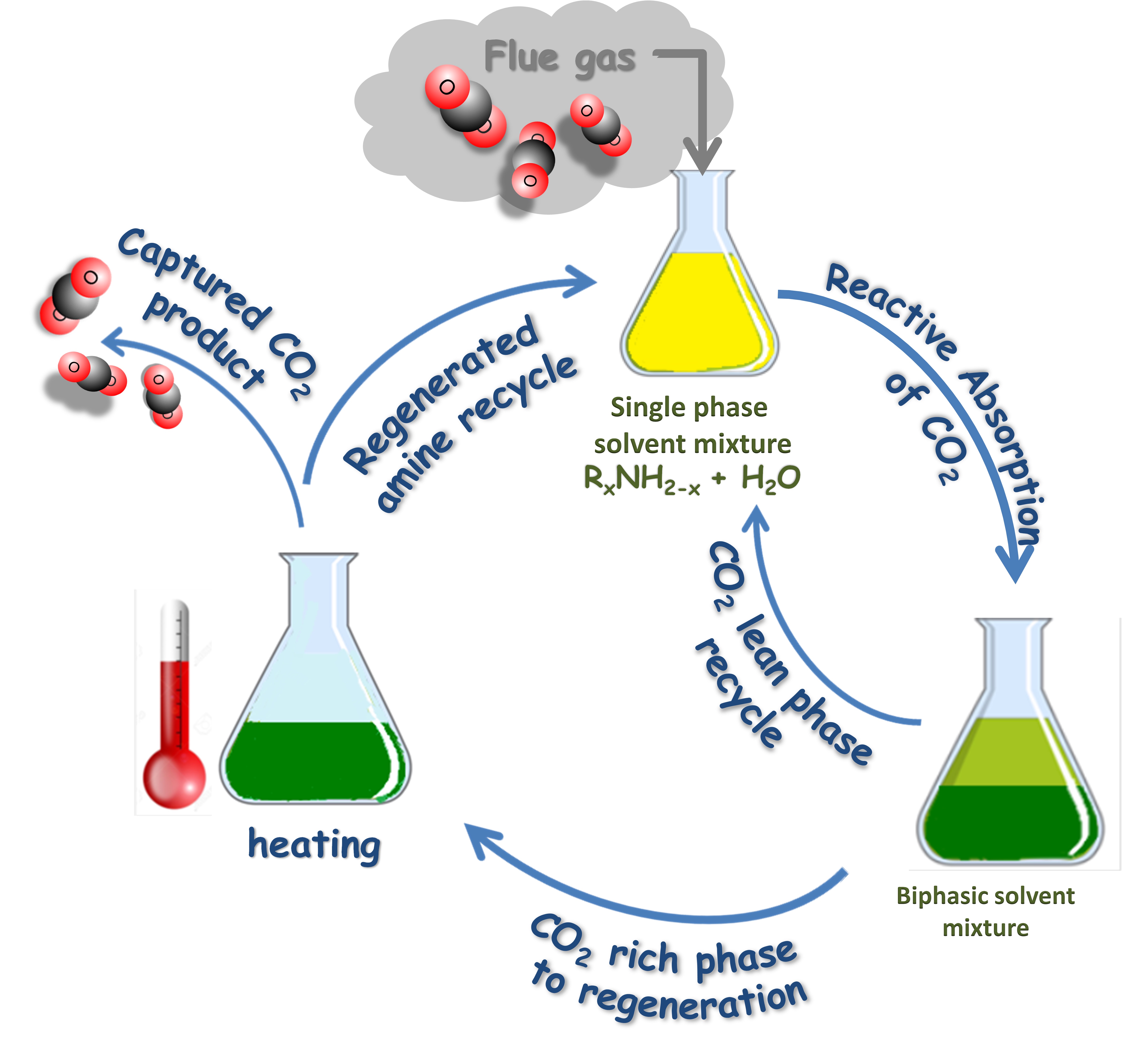 Τα μίγματα αυτά καταφέρνουν να δεσμεύουν το CO2 με πολύ μικρότερη απαιτούμενη ενέργεια, μειώνοντας έτσι το λειτουργικό κόστος της δέσμευσης κατά περίπου 40 % από την υπάρχουσα καλύτερη τεχνολογία. Το νέο υδατικό διάλυμα αμινών που ανακαλύφθηκε έχει τη μοναδική ιδιότητα ότι κατά την χημική απορρόφηση του CO2 από τις αμίνες, το μίγμα τους διαχωρίζεται αυθορμήτως, χωρίς την χρήση θερμότητας (δηλαδή χωρίς επιπρόσθετο κόστος ενέργειας), σε δυο μη-αναμίξιμες υγρές φάσεις.
