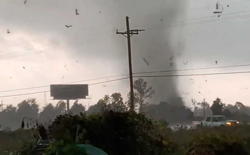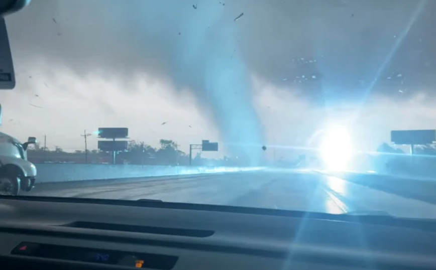 Πλάνα δείχνουν τον ανεμοστρόβιλο να περνά μπροστά από τους αυτοκινητιστές με τα συντρίμμια να πετάγονται στον αέρα από τους ισχυρούς ανέμους ενώ από το πέρασμά του προκαλούνται εκρήξεις.