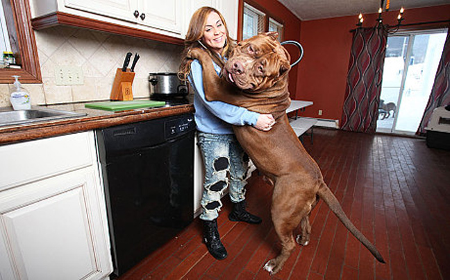 Όπως λένε, το τρομακτικό αυτό ζώο, είναι μόνο τρομακτικός στην όψη γιατί στην πραγματικότητα είναι 100% άκακος και αξιόπιστος. Το συγκεκριμένο πιτ μπουλ, είναι τρεις φορές μεγαλύτερο από ένα συνηθισμένο σκυλί τέτοιας ράτσας.