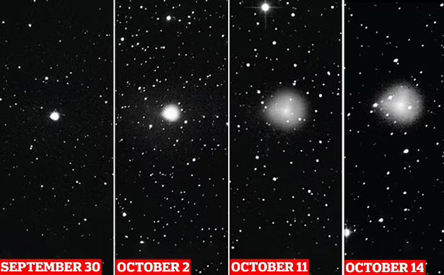 Κατά τη διάρκεια της πιο πρόσφατης έκρηξής του, ο κομήτης εκτόξευσε «κελύφη κρυομάγματος» στο διάστημα. «Αρχικά έμοιαζε με ένα φωτεινό συμπαγές αντικείμενο», λέει ο ερασιτέχνης αστρονόμος, Έλιοτ Χέρμαν, «τώρα το διαστελλόμενο νέφος έχει πλάτος 1,3 λεπτά της μοίρας και αρκετά διαφανές για να λάμπουν τα αστέρια στο φόντο».
