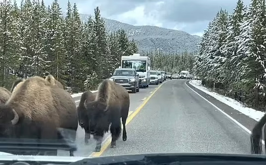 Τα μεγάλα ζώα έχουν καταγραφεί να κινούνται αργά μέσα στο δρόμο και να προσπερνούν χαλαρά τα αυτοκίνητα ενώ έχουν προκαλέσει και ένα μίνι μποτιλιάρισμα προς την είσοδο του διάσημου πάρκου του Ουαϊόμινγκ.