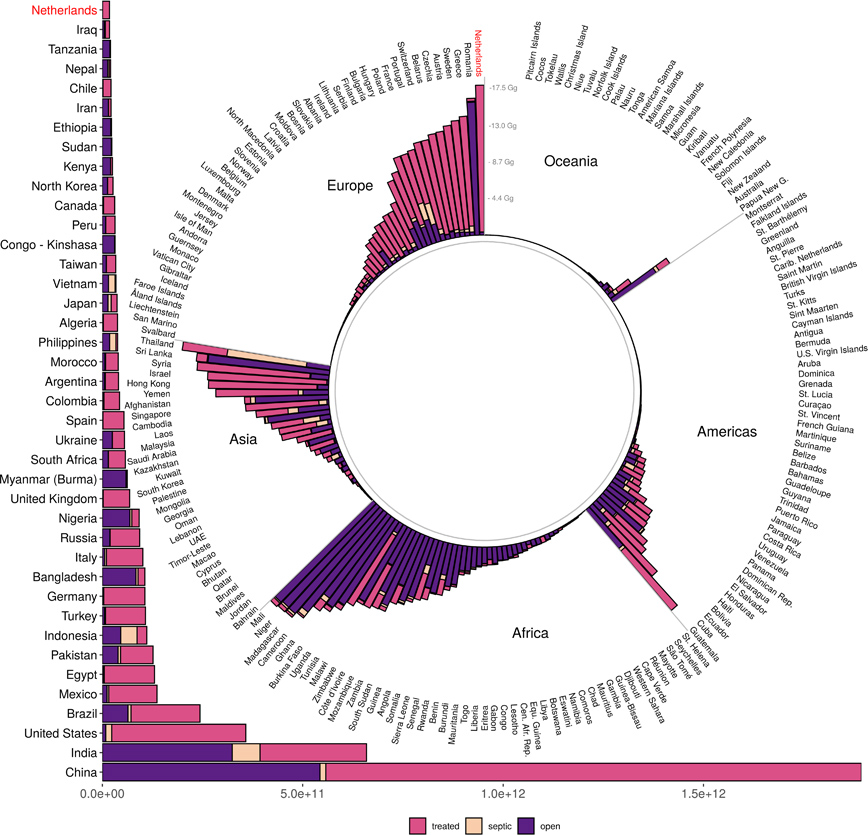 Η συνολική συνολική εισροή λυμάτων είναι 6,2 Tg N, με 3,9 Tg από υπονόμους, 0,3 Tg από σηπτικά και 2 Tg από άμεση είσοδο. Οι κορυφαίες 40 χώρες εμφανίζονται στο οριζόντιο ραβδωτό γράφημα. Οι υπόλοιπες χώρες βρίσκονται στον τροχό, ομαδοποιημένες ανά ήπειρο ή μεγαλύτερη γεωγραφική περιοχή. Οι τιμές για όλες τις χώρες αναφέρονται επίσης στον Πίνακα S5 στο Αρχείο S1. Σημειώστε ότι η Ολλανδία εμφανίζεται και στις δύο θέσεις (με κόκκινο) για να βοηθήσει στη σύνδεση της κλίμακας των δύο τμημάτων του σχήματος.