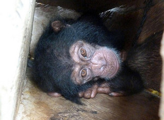 Κλεισμένος μέσα σε ένα μικρό ξύλινο κουτί, τρομοκρατημένος, βρέθηκε ο μικρός χιμπατζής της φωτογραφίας. Εκεί τον είχαν κλείσει οι λαθρέμποροι ζώων που είχαν πρώτα σκοτώσει τη μητέρα του, για να της αποσπάσουν το παιδί της.