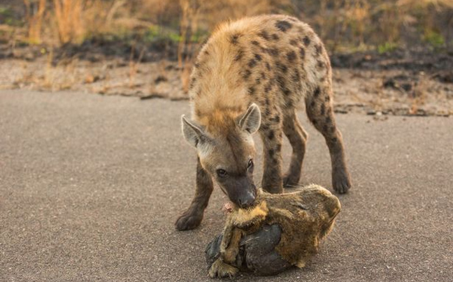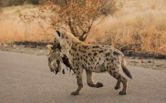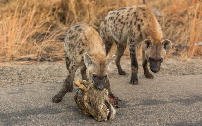Οι σκληρές αλλά δυναμικές φωτογραφίες όπου μια ύαινα περιφέρει το κεφάλι ενός λιονταριού σαν τρόπαιο, δίνουν ένα ισχυρό μήνυμα στους αντιπάλους της.