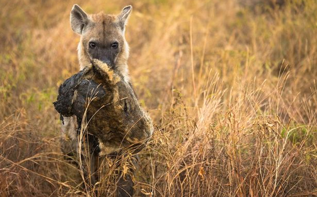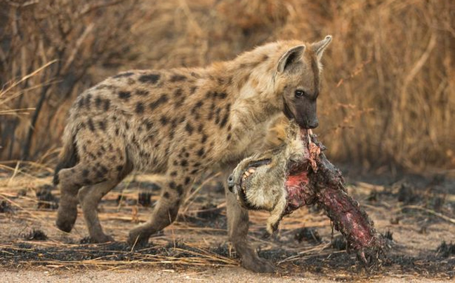 «Είναι σκληρές εικόνες, αλλά έτσι είναι η φύση. Οι φωτογραφίες αυτές συμβολίζουν την άγρια αντιπαλότητα που έχουν τα λιοντάρια με τις ύαινες. Σκοπός τους είναι να αλληλοεξοντωθούν. Σε αυτή τη περίπτωση, η ύαινα περιφέρει το κεφάλι του χειρότερου εχθρού της, με σκοπό να τρομοκρατήσει τους αντιπάλους της», λέει η φωτογράφος.