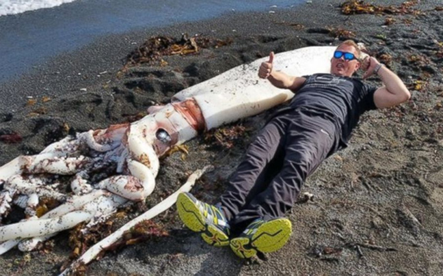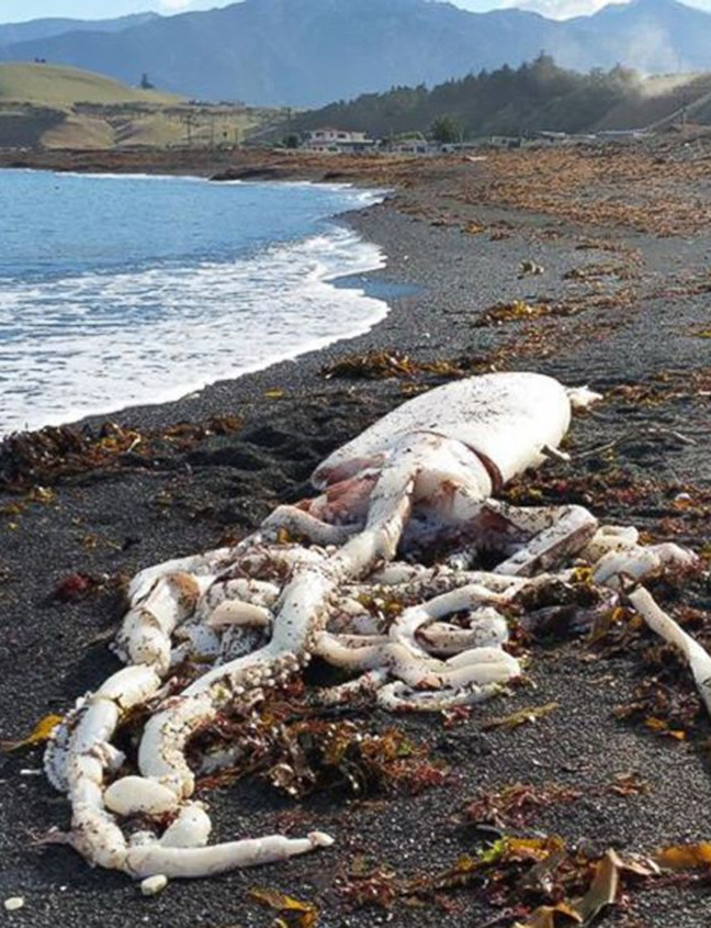 Τα κύματα σε μια ακτή στην πόλη Kaikoura, της Νέας Ζηλανδίας, ξέβρασαν αυτό το γιγαντιαίο καλαμάρι, το σώμα του οποίου είναι πάνω από 2 μέτρα και έχει διάμετρο 19 εκατοστά. Όσο για τα πλοκάμια του, αυτά στο άνοιγμά τους φτάνουν τα πέντε μέτρα.