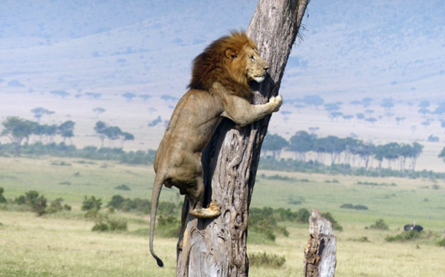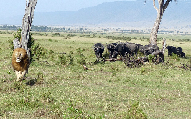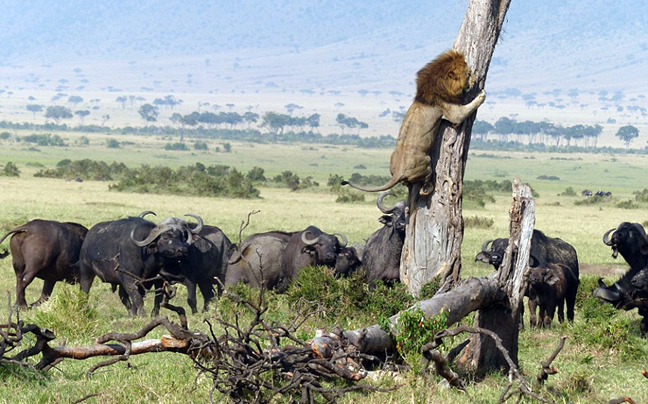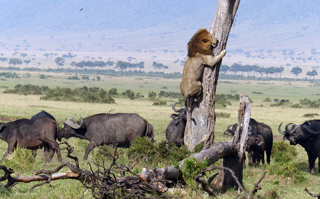 «Ξαφνικά, από το πουθενά, ένα αρσενικό λιοντάρι πετάχτηκε από μια κρυψώνα, αλλά σκαρφάλωσε αμέσως πάνω στο δέντρο με τα βουβάλια να κινούνται απειλητικά.», ανέφερε ο Comyn.