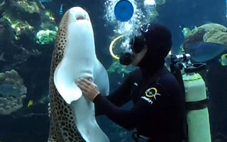 Ο καθαριστής- με στολή δύτη- ακουμπά και χαϊδεύει τον καρχαρία-λεοπάρδαλη και του ξύνει την κοιλιά.