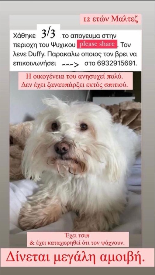 Το εικονιζόμενο σκυλάκι ράτσας Μαλτέζ χάθηκε το απόγευμα της Πέμπτη 3 Μαρτίου στην περιοχή του Ψυχικού και η οικογένειά του ζητάει βοήθεια για τον εντοπισμό του, δίνοντας αμοιβή.