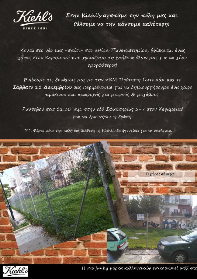 Το Σάββατο 11 Δεκεμβρίου οι φίλοι εθελοντές της Kiehl’s, του Attica και της «ΚΜ Πρότυπη Γειτονιά» θα δουλέψουν εντατικά για να διαμορφώσουν το χώρο επί της οδού Σφακτηρίας 5-7, βάσει του σχεδίου του αρχιτεκτονικού γραφείου VOIS, που προβλέπει πράσινο, δένδρα, και πρωτότυπα παιχνίδια, μια φωτεινή ανάσα στο γκρίζο της περιοχής. Στα σχέδια της Kiehl’s είναι ακόμη η δημιουργία ενός μικρού κήπου με βότανα και φυτά που φύονται παραδοσιακά, στην Αθήνα.