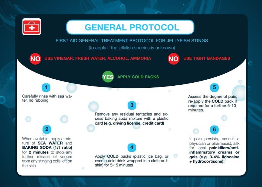 - Αν είναι διαθέσιμο, εφαρμόζουμε ένα μίγμα θαλασσινού νερού και μαγειρικής σόδας (σε αναλογία 1:1) για δύο λεπτά, ώστε να σταματήσει οποιαδήποτε επιπλέον έκκριση δηλητηρίου από πιθανά υπολείμματα κυττάρων πλοκαμιών που έχουν μείνει στο δέρμα.