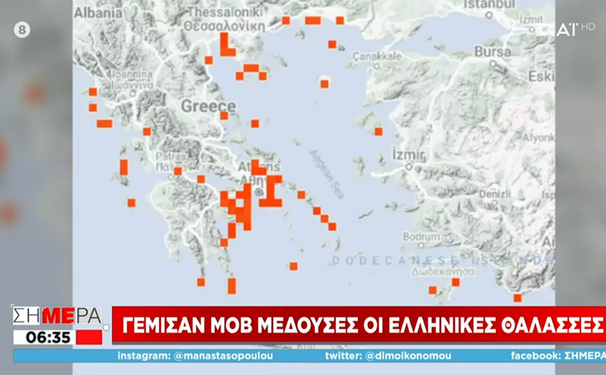 Μεγάλη ανησυχία έχουν προκαλέσει οι μωβ μέδουσες στις ελληνικές θάλασσες, όπου παρατηρούνται μεγάλες συγκεντρώσεις. Αυτή τη στιγμή οι μωβ μέδουσες βρίσκονται στο Ιόνιο, τη Χαλκιδική, τη Ρόδο, το Βορειοανατολικό Αιγαίο, στις παραλίες της Αττικής και νότια της Πελοποννήσου.