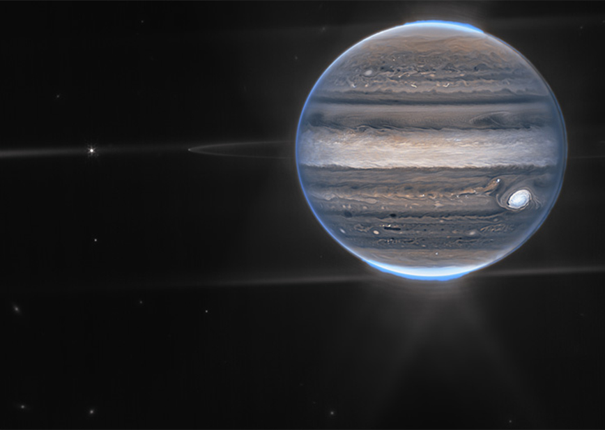 Οι συγκεκριμένες υπέρυθρες φωτογραφίες τραβήχτηκαν στο τέλος του Ιουλίου του 2022 και στη συνέχεια χρωματίστηκαν τεχνητά ενώ παρέχουν, μεταξύ άλλων, τις καλύτερες έως τώρα παρατηρήσεις για το τεράστιο σέλας που δημιουργείται στους δύο πόλους του Δία. Φαίνονται επίσης η γνωστή Μεγάλη Ερυθρά Κηλίδα (μια γιγάντια καταιγίδα), άλλες μικρότερες καταιγίδες, αχνοί δακτύλιοι και δύο μικρότεροι δορυφόροι του, η Αμάλθεια και η Αδράστεια, διαμέτρου περίπου 200 και 20 χιλιομέτρων αντίστοιχα.