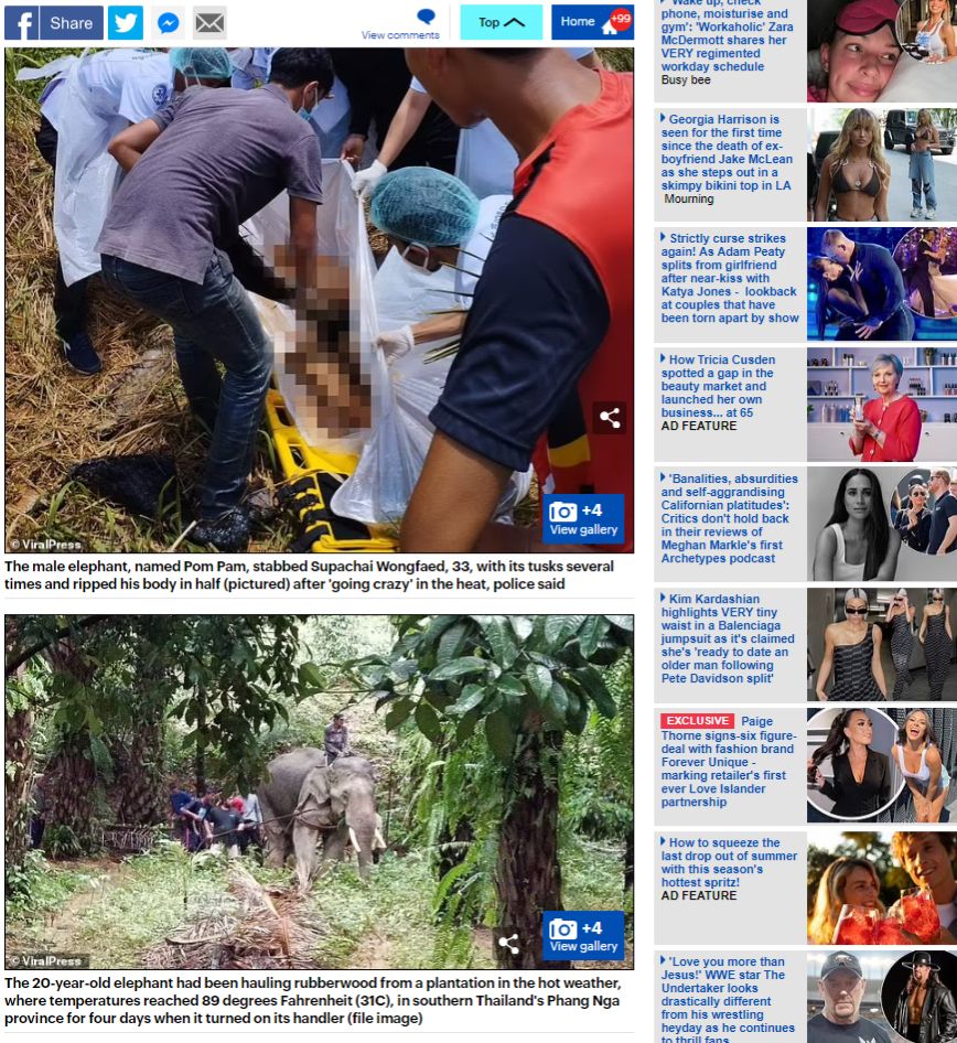 Η ζέστη και η κούραση «τρέλαναν» έναν 20χρονο ελέφαντα στην Ταϊλάνδη ο οποίος με τους χαυλιόδοντες του χτύπησε πολλές φορές τον ιδιοκτήτη και χειριστή του μέχρι που τον έκοψε στη μέση. Το ζώο φορτώθηκε με ξύλα από μια φυτεία κατά τη διάρκεια του καύσωνα στην Ταϊλάνδη με αποτέλεσμα να μην αντέξει άλλο και να προχωρήσει στην πράξη αυτή.