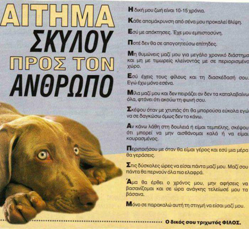 Μια αφίσα η οποία αναγράφει «Αίτημα σκύλου προς τον άνθρωπο» περιγράφει με τον καλύτερο τρόπο ποια θα ήταν τα πράγματα που θα έλεγε ένας σκύλος στον άνθρωπο του αν θα μπορούσε να μιλήσει.