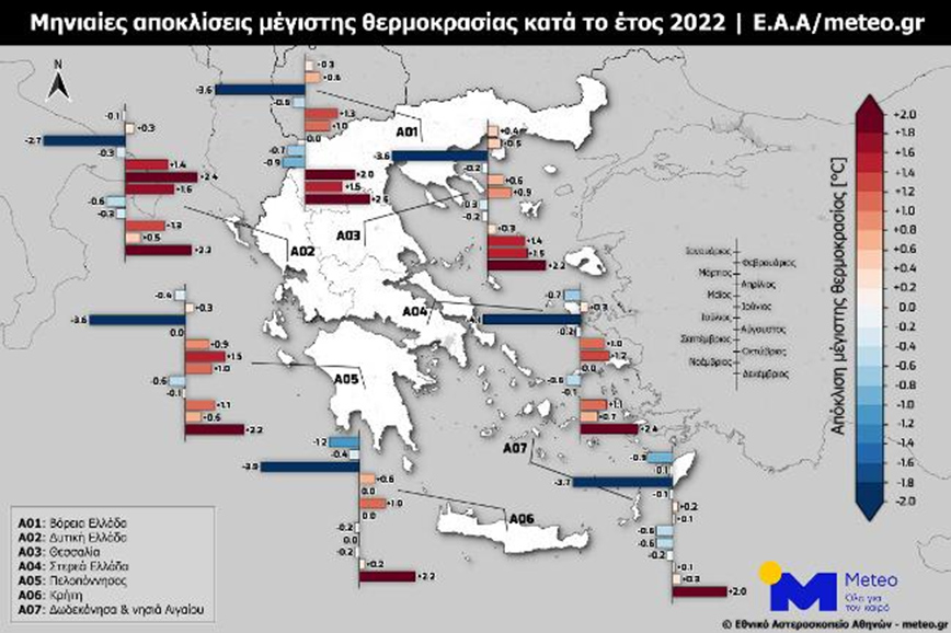 Το Meteo του Εθνικού Αστεροσκοπείου Αθηνών συγκέντρωσε σε ένα αναλυτικό χάρτη την πορεία που κατέγραψε ανά μήνα η θερμοκρασία στη χώρα για το 2022. Μάλιστα, τα δεδομένα υπολογίστηκαν ως προς τον μέσο όρο της τελευταίας δεκαετίας (2010-2019, η οποία σημειώνεται ότι ήταν μια θερμή δεκαετία) σύμφωνα με τις καταγραφές 53 μετεωρολογικών σταθμών.
