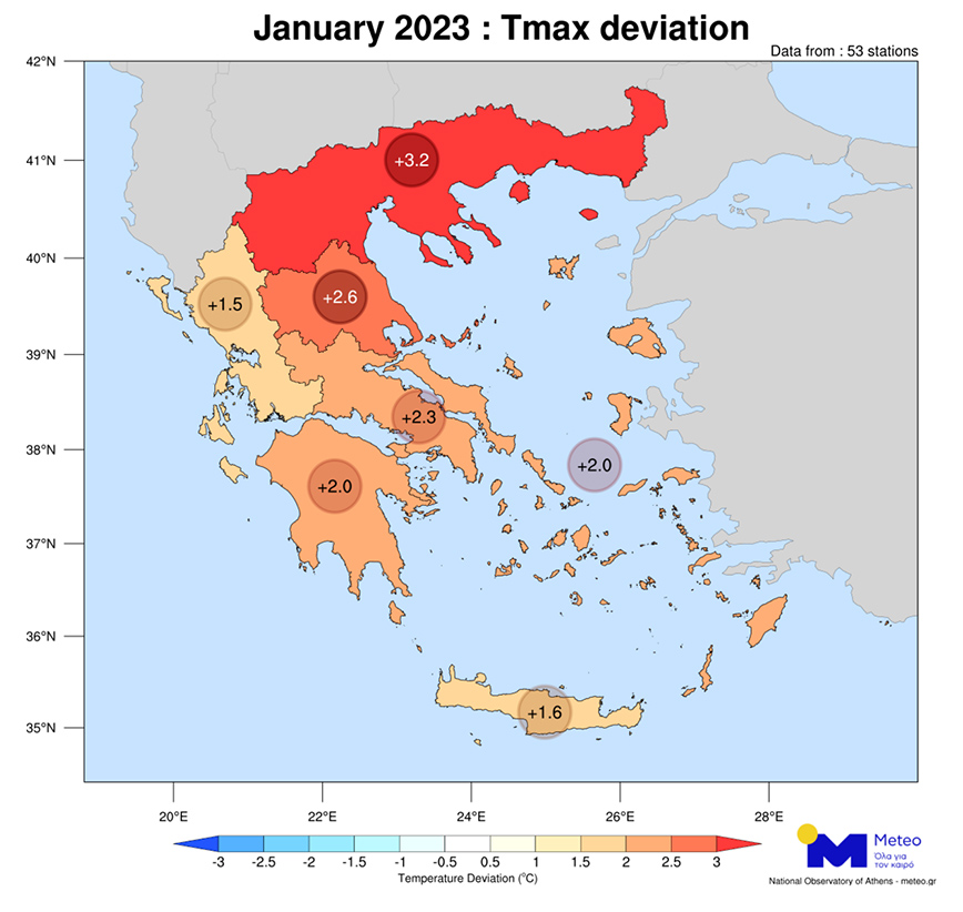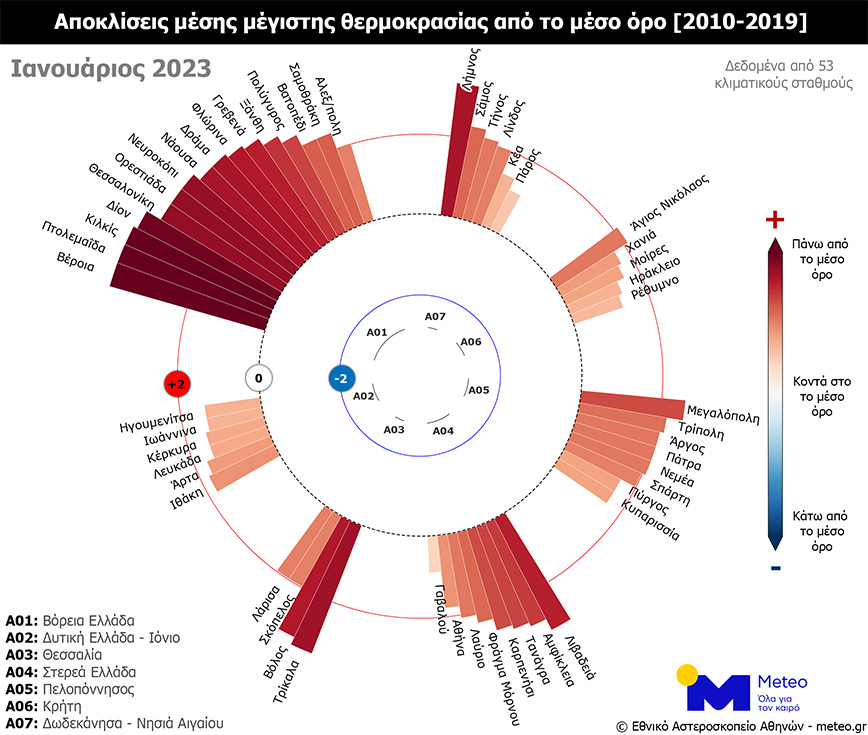 Στην Αθήνα η μέση μηνιαία τιμή απόκλισης της μέγιστης θερμοκρασίας ήταν +1,8°C, με 25 ημέρες να είναι θερμότερες από τα κανονικά για την εποχή επίπεδα, και στη Θεσσαλονίκη καταγράφηκε ο πιο θερμός Ιανουάριος από το 2010, με θετική απόκλιση +3,6°C και 24 ημέρες θετικών αποκλίσεων θερμοκρασίας. Ένα ακόμη ενδιαφέρον στοιχείο είναι ότι σε κανέναν μετεωρολογικό σταθμό δεν καταγράφηκαν αρνητικές μέσες μηνιαίες αποκλίσεις θερμοκρασίας.