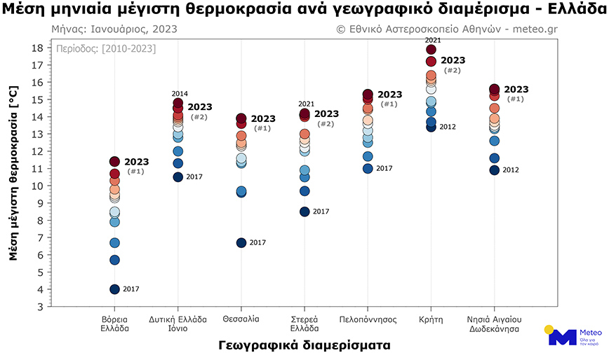Ο φετινός Ιανουάριος ήταν ο θερμότερος, τουλάχιστον από το 2010, στη Βόρεια Ελλάδα, στη Θεσσαλία, στην Πελοπόννησο και στα Νησιά του Αιγαίου (εκτός Κρήτης). Στις υπόλοιπες περιοχές κατατάσσεται ως ο δεύτερος θερμότερος, πίσω από το 2014 για τη Δυτική Ελλάδα, και πίσω από το 2021 για τη Στερεά Ελλάδα και την Κρήτη.