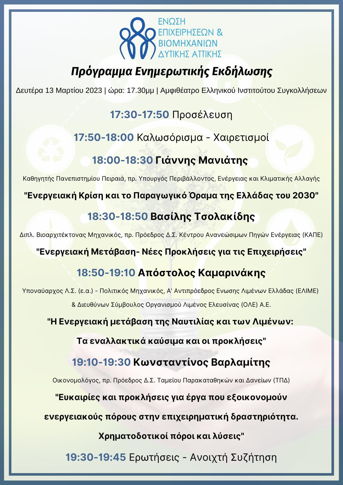 Η ενεργειακή μετάβαση θα βρεθεί στο επίκεντρο ενημερωτικής εκδήλωσης που διοργανώνει η Ένωση Επιχειρήσεων και Βιομηχανιών Δυτικής Αττικής το απόγευμα της Δευτέρας 13 Μαρτίου, ώρα 17:30, στο αμφιθέατρο του Ελληνικού Ινστιτούτου Συγκολλήσεων (Τραπεζούντος και Διγενή Ακρίτα, Ελευσίνα).