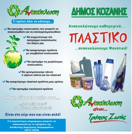 Στο πλαίσιο του νέου αυτού προγράμματος τοποθετηθήκαν είκοσι κάδοι ανακύκλωσης πλαστικού. Αξιολογώντας τα πρώτα μηνύματα από αυτή την προσπάθεια που ήταν θετικά, αποδεικνύεται η περιβαλλοντική συνείδηση που έχει αναπτυχθεί αλλά και το ότι πλέον η ανακύκλωση έχει γίνει αναπόσπαστο κομμάτι της ζωής των κατοίκων του Δήμου Κοζάνης.