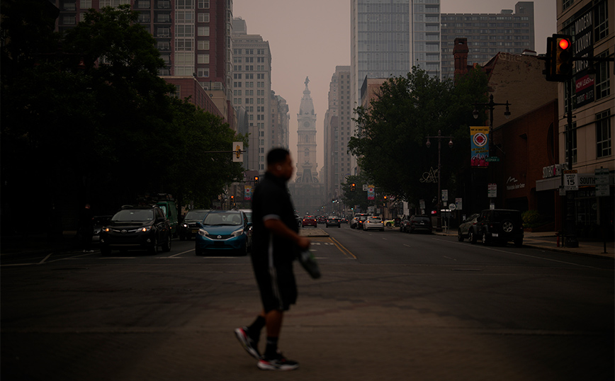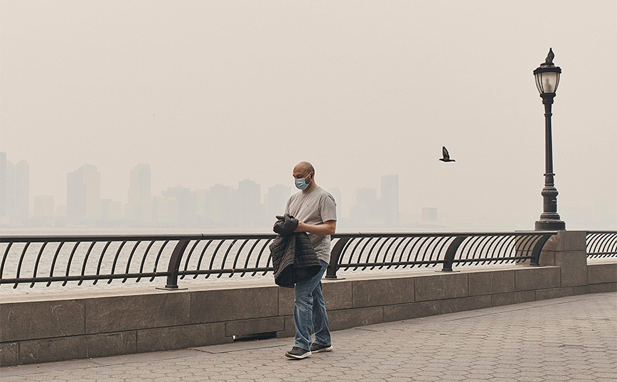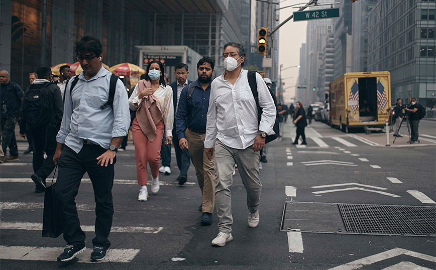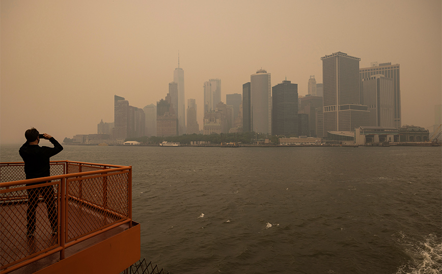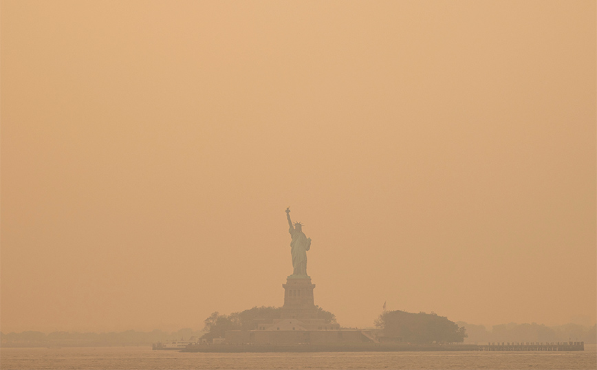 Στη Νέα Υόρκη, το άγαλμα της Ελευθερίας και οι ουρανοξύστες του Μανχάταν είχαν καλυφθεί από πορτοκαλί καταχνιά, ενώ μάσκες –απομεινάρια της πανδημίας του νέου κορονοϊού– ξανάκαναν την εμφάνισή τους στους δρόμους.